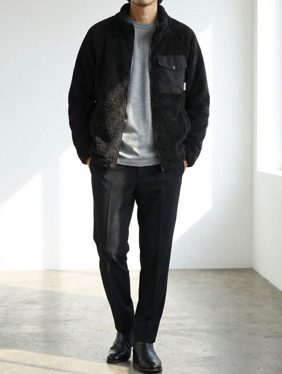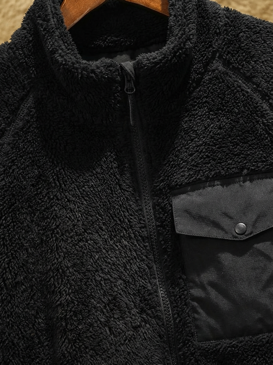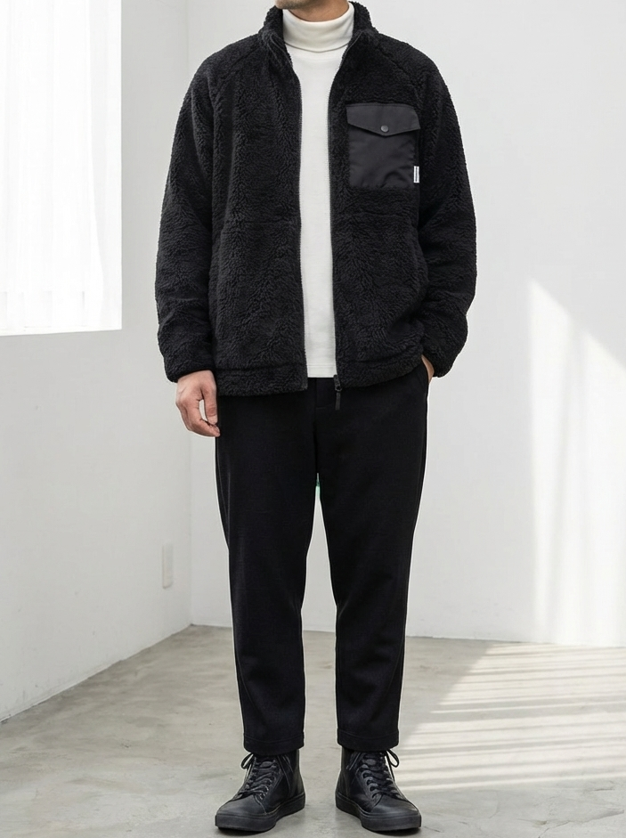上品な黒をベースにした、機能美と快適さを兼ね備えたマウンテンフリースジャケット。