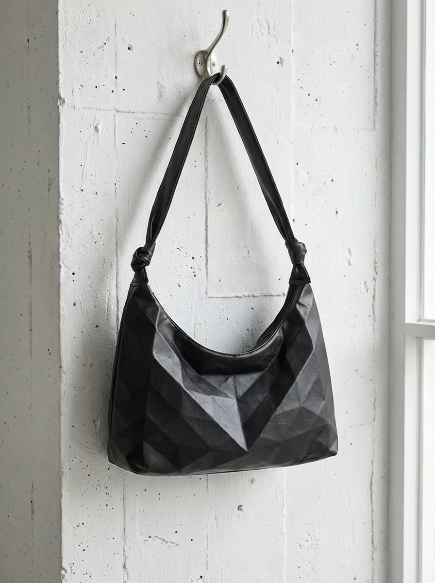 • 3D Geometric Design: ひし形の立体カッティングが、ミニマルな黒に奥行きと個性を。