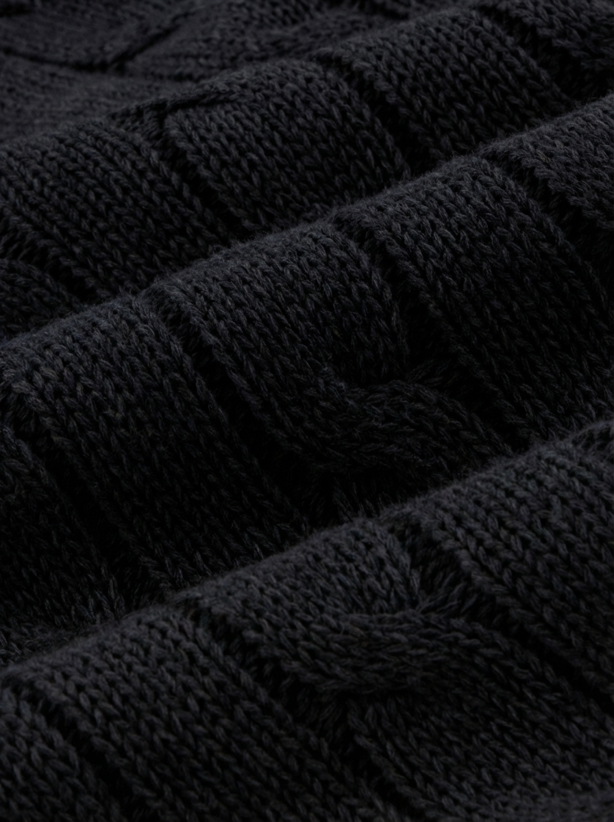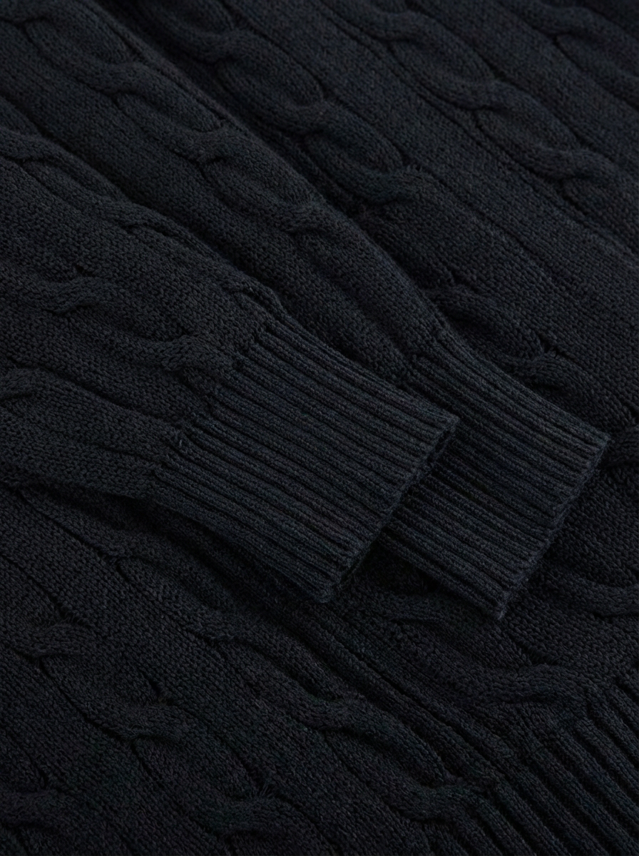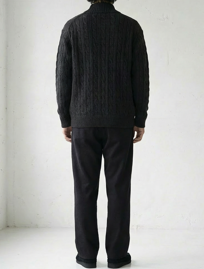 立体的なケーブル編みと上品なジップデザインが特徴のカーディガン。
