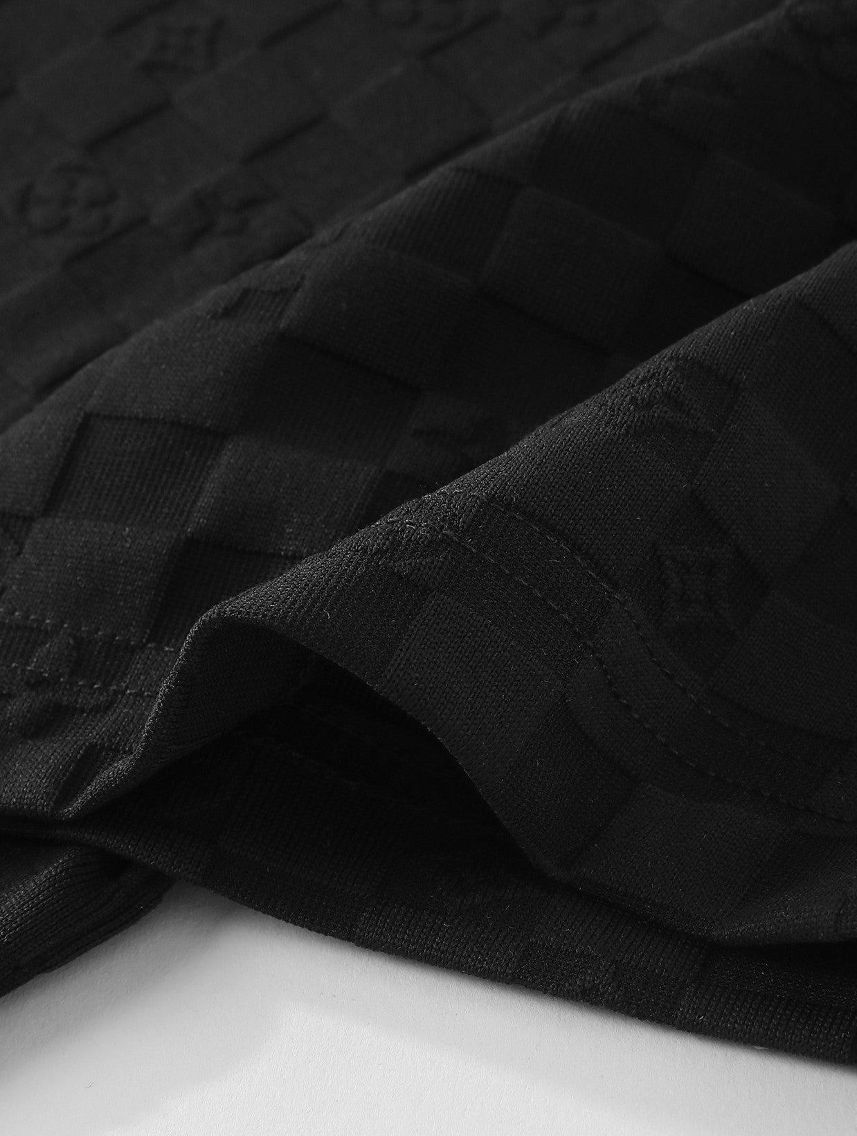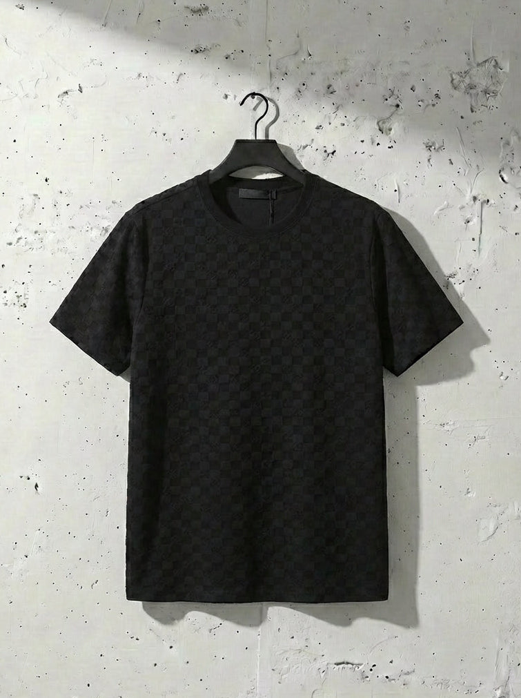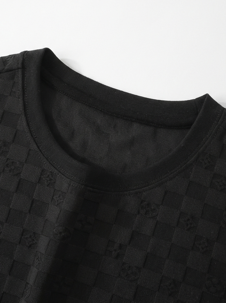 ジャカード織りで表現した細かなチェッカーテクスチャーが、シンプルな黒を豊かに見せる半袖クルーネック。